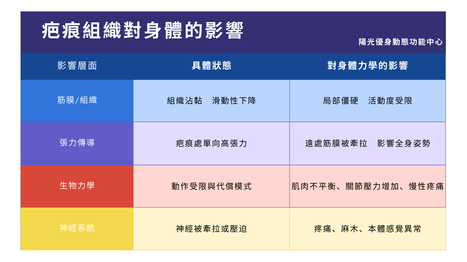 - 全身連動影響(解剖列車概念): 由於筋膜系統是連續的(如胸腰筋膜連接了身體四面八方的肌群),一個部位的疤痕產生的局部張力會透過筋膜系統傳導到遠處。
